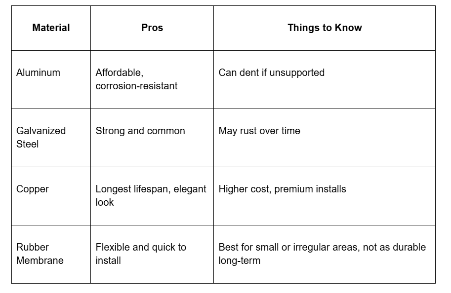- Rubber or membrane: Flexible, good for tricky areas, but not as long-lasting